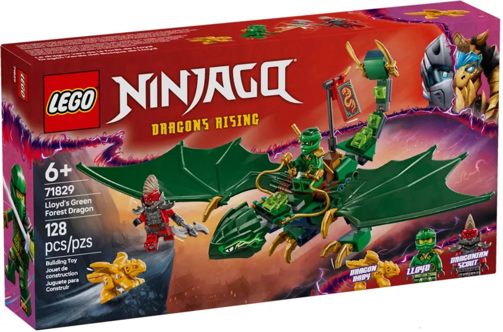 - Dragon NINJAGO® articulé – Une réplique à construire du dragon vert de la forêt de Lloyd, doté d’une queue, d’un cou, de pattes, de mains et de grandes ailes mobiles, ainsi qu’une selle permettant à une minifigurine de monter sur son dos.